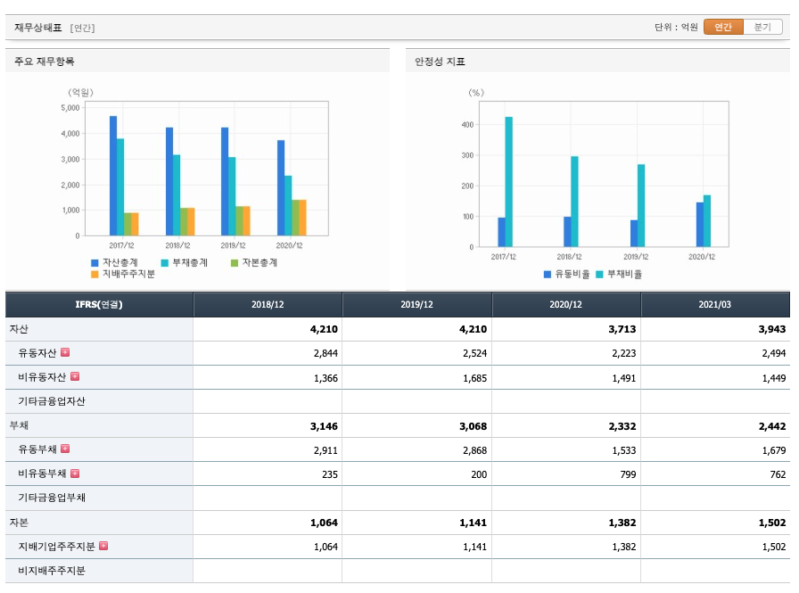 자산은 2018년 4210억원, 2019년 4210억원, 2020년 3713억원으로 감소, 2021년 1분기 3943억원으로 증가하였습니다.
