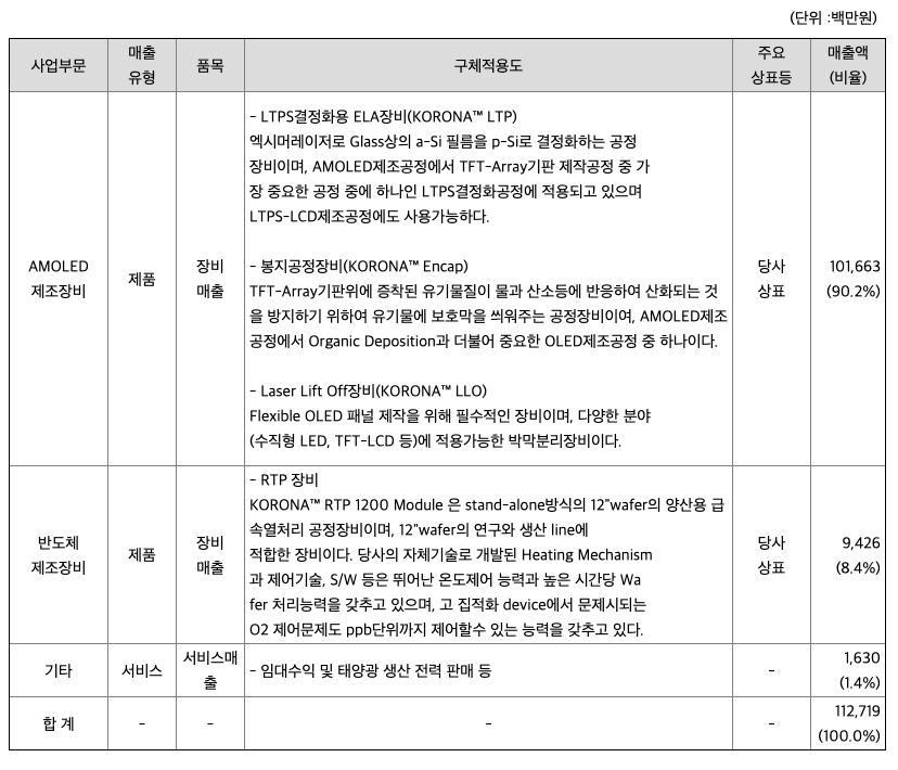 ① AMOLED장비 제조사업 (제품명 : KORONA™ LTP-ELA, KORONA™ Encap , KORONA™ LLO)