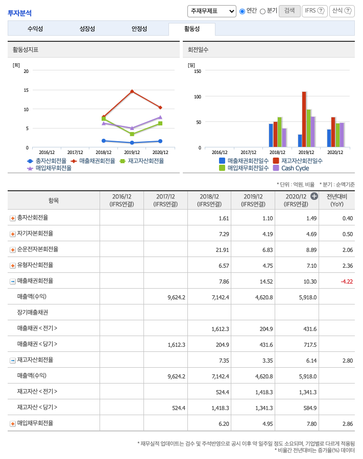 재고자산회전율 : 2018년 약 1418억원, 2019년 약 1341억원, 2020년 약 584억원이고, 회전율은 2018년 약 7회, 2019년 약 3회, 2020년 약 6회로 안정적입니다.
