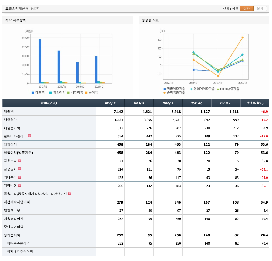 매출액 : 2018년 7142억원, 2019년 4621억원으로 감소하였고, 2020년 5918억원으로 증가하였고, 2021년 1분기 억원으로 전년동기대비 감소하였습니다. 2021년 1분기는 전년동기대비 -6.9% 감소하였습니다. 2020년 분기별로 보면 2분기 1285억원, 3분기 1636억원, 4분기 1786억원입니다.
