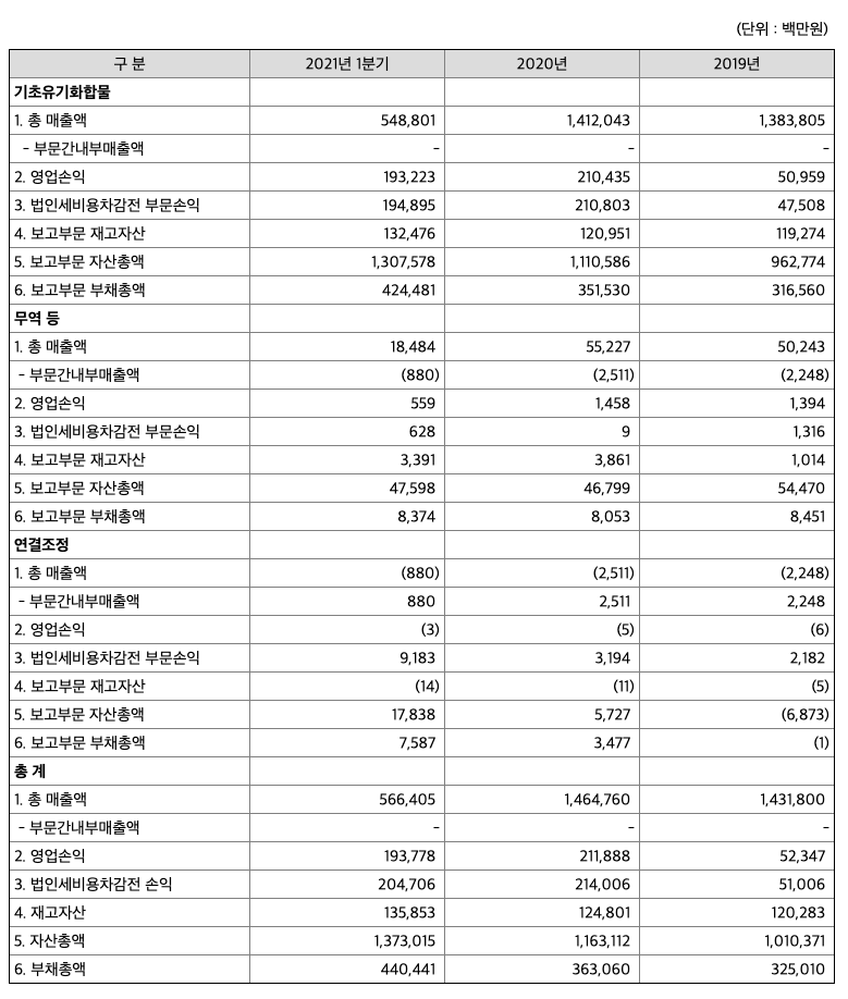 '20년 4분기 Phenol, BPA 주요 메이커의 생산차질 및 가동중단으로 인한 공급 Tight 영향으로 계절적 비수기임에도 수요 견조세가 이어지며 제품 가격이 급등해 '20년 3분기 대비 4분기 영업이익은 247억 원 증가하였습니다. '21년 1분기 초반, S/D 메이커의 재가동 및 중국 춘절 기간 수요 감소 영향으로 제품 가격 보합세를 보였으나, 일본 지진 및 미국 한파 영향으로 인한 공급 차질로 춘절 연휴 이후 다시 가격 상승세를 띠었습니다. 더불어 1분기 종반, 전력 문제로 인한 대만 지역 가동중단과 중국발 물동량 급증으로 인한 Global 공급 Tight 영향으로 연이은 제품 가격 상승세가 지속되었습니다. 이에 따라 '21년 1분기 매출액은 전년대비 1,929억 원, 영업이익은 1,795억 원 증가하였습니다.