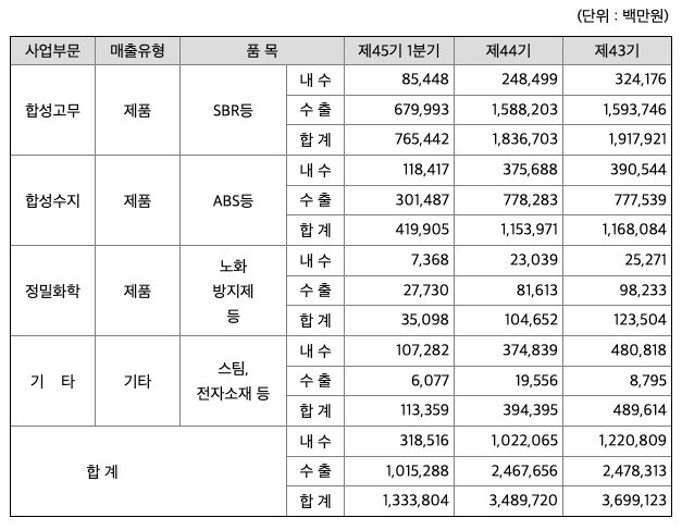 당사의 중장기 사업 포트폴리오의 세계화 전략에 따라 합성고무, 합성수지, 고무약품 등 사업의 시장적 근접성, 지리적 경쟁력, 그리고 원료 확보의 용이성 등 최상의 경쟁력을 갖춘 최적의 글로벌 생산거점 확보를 위한 검토가 진행되고 있습니다. 또한 미래성장 동력사업의 발굴 및 진출을 위해, 기존 사업 군과 연관성이 있거나 또는 차별화 된 신수종 사업 등에 대해서도 사업 진출가능성을 지속적으로 검토하고 있습니다.