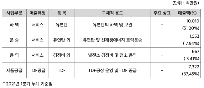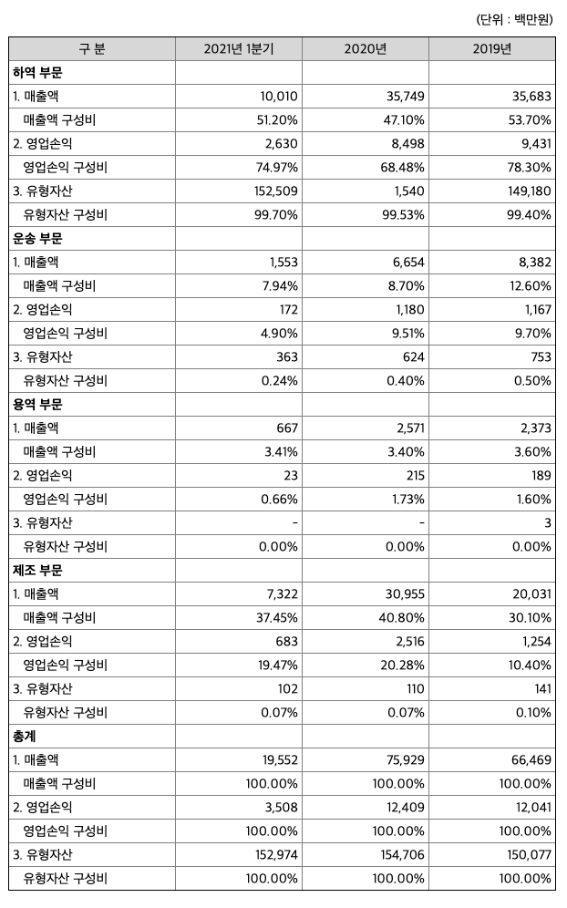 항만운영 부문은 화주사의 발전소 연료용 유연탄 및 신재생에너지를 하역하여 보관/출고하는 사업입니다. 온실가스와 미세먼지 등 환경문제로 인하여 석탄화력발전소의업황이 위축되는 추세이나, 여수국가산업단지 내 발전용 전력의 안정적 공급을 위해서는 기존 화력발전소의 가동이 필수적이기 때문에 발전소 연료용 유연탄의 하역 등의 사업은 안정적인 매출을 유지하고 있습니다. TDF 제품공급 부문은 버려지는 자원(폐타이어)을 재활용하여 발전소 연료(TDF)로 가공하는 사업입니다.