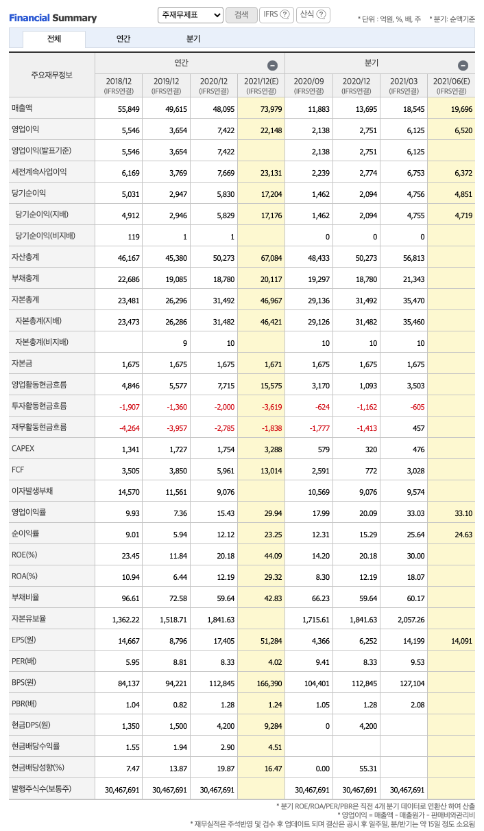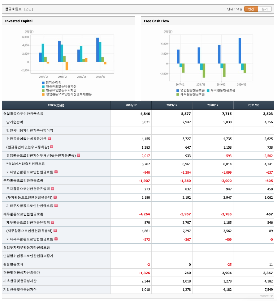 영업활동 현금흐름 : 2018년 4846억원, 2019년 5577억원, 2020년 7715억원, 2021년 1분기 3503억원으로 영업활동 현금흐름이 원활합니다.