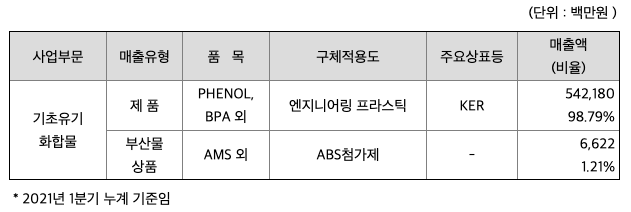 당사의 1차 생산제품인 PHENOL, ACETONE은 나프타분해에서 나오는 벤젠 및 프로필렌 등을 원료로 제조되는 산업용 기초 석유화학 제품이며, 동 제품은 건축 전자산업의 주요소재가 되는 PHENOL수지, 도료, 용해제, 약품등 광범위한 산업원료가 되며, BPA, 엔지니어링 프라스틱, EPOXY수지, MIBK 및 정밀화학으로 연결되는 화학공업의 소재로서 파급효과가 매우 큽니다.