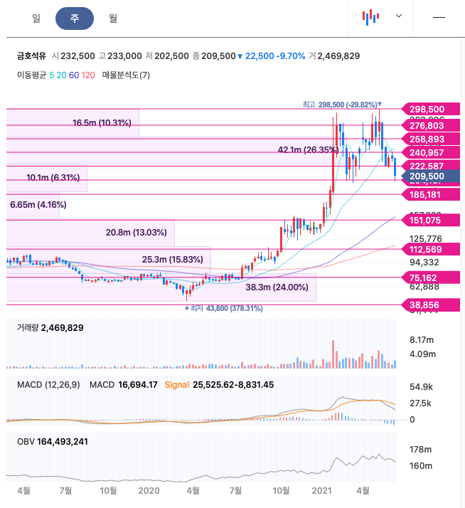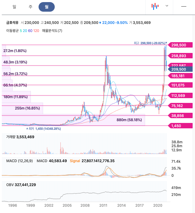 금호석유는 20년 9월에 급등한 이후 지속적으로 우상향하였고, 21년 5월에 최고 298,500원을 찍은 뒤 조정을 받고 있습니다.