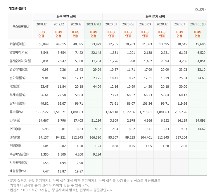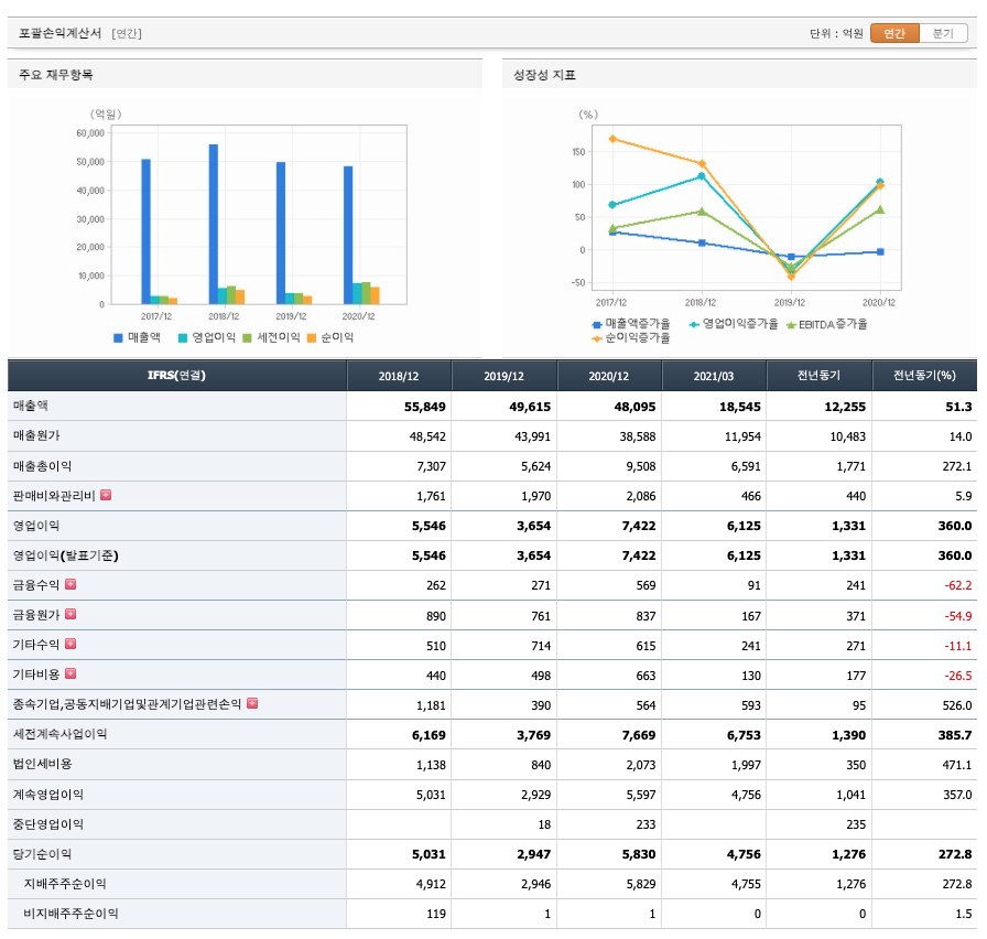 매출액 : 2018년 55,849억원, 2019년 49,615억원, 2020년 48,095억원으로 감소, 2021년 1분기 18,545억원으로 전년동기대비 증가하였습니다. 2021년 1분기는 전년동기대비 51.3% 증가하였습니다. 2020년 분기별로 보면 2분기 10,263억원, 3분기 11,883억원, 4분기 13,695억원입니다.