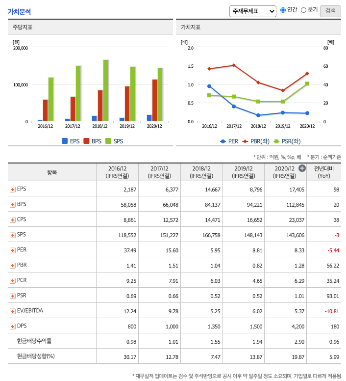 FCF(미래현금흐름) : 2018년 3505억원, 2019년 3850억원, 2020년 5961억원으로 미래현금흐름이 좋습니다. 2021년은 13,014억원으로 추정됩니다.