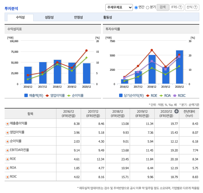 영업이익률 : 2016년 약 3.96%, 2017년 약 5.18%로 증가, 2018년 약 9.93%로 증가, 2019년 약 7.36%로 감소, 2020년 약 15.43%으로 증가하였습니다.
