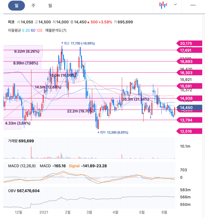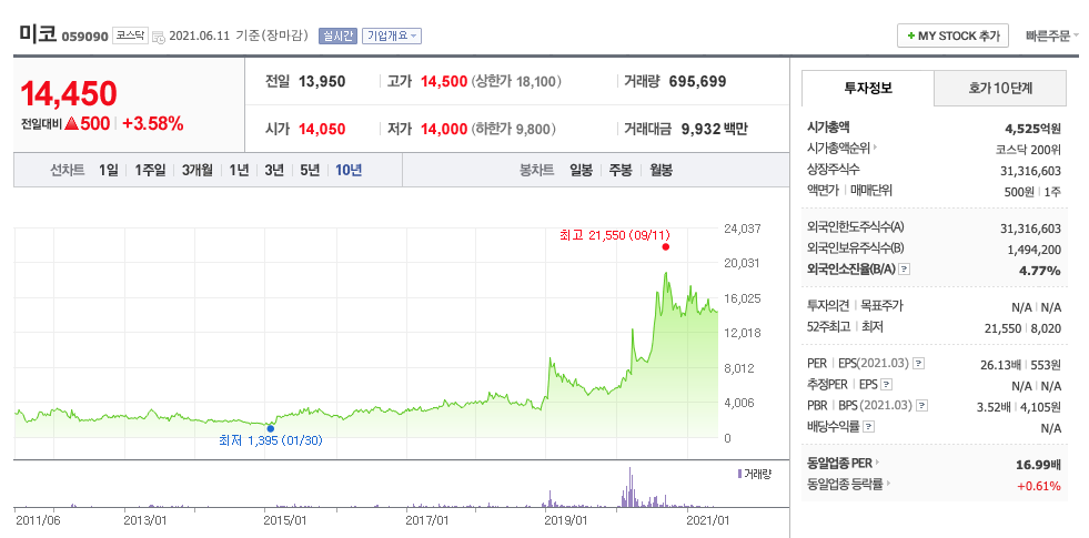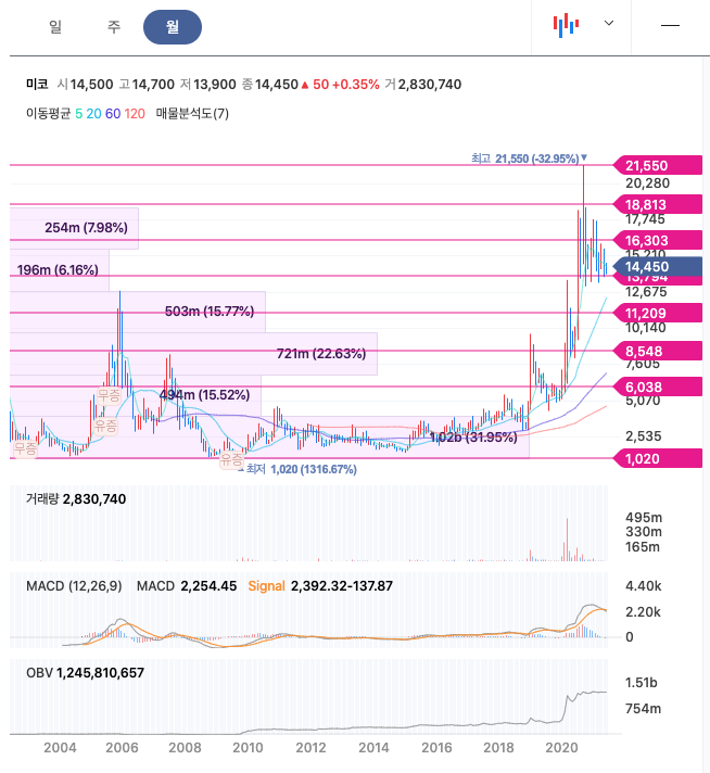 미코는 20년 6월 주가가 급등하여 20년 9월에 최고 21,550원을 찍고, 이후 조정을 받고 있습니다.