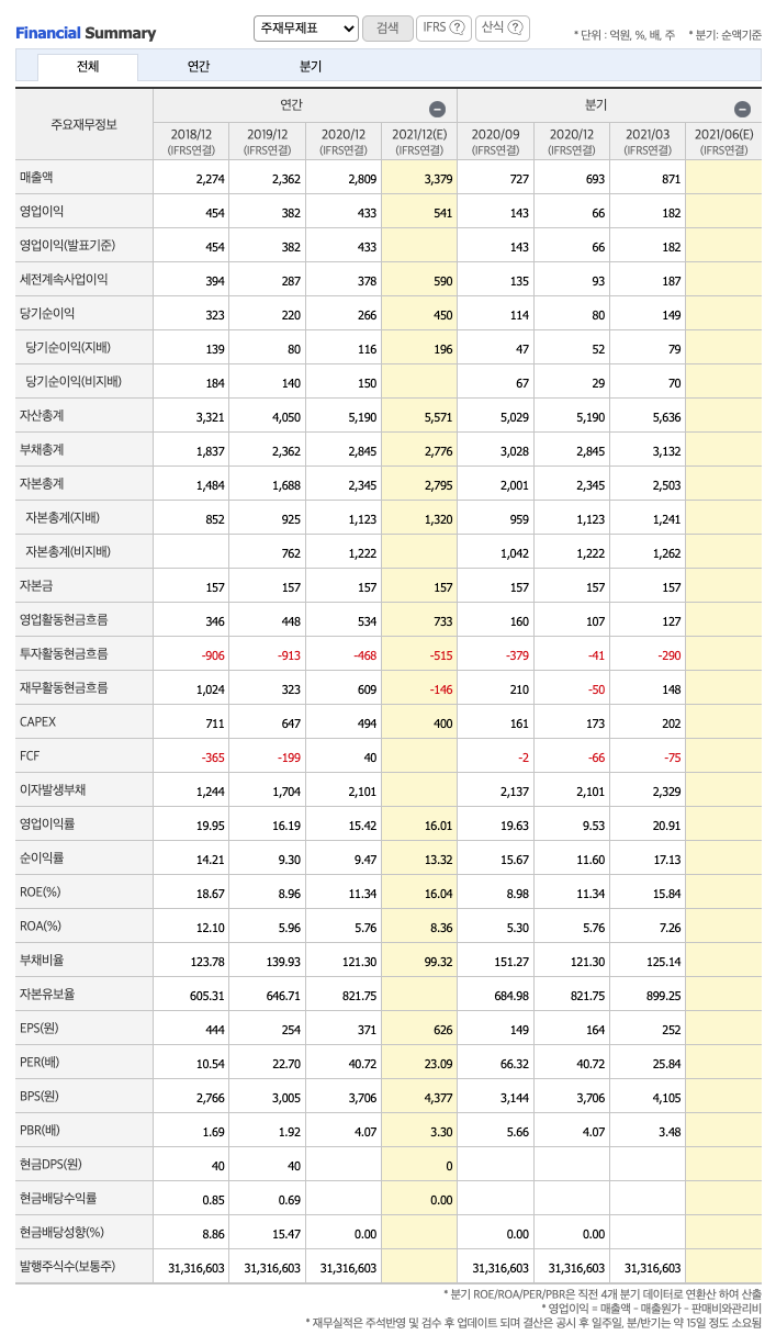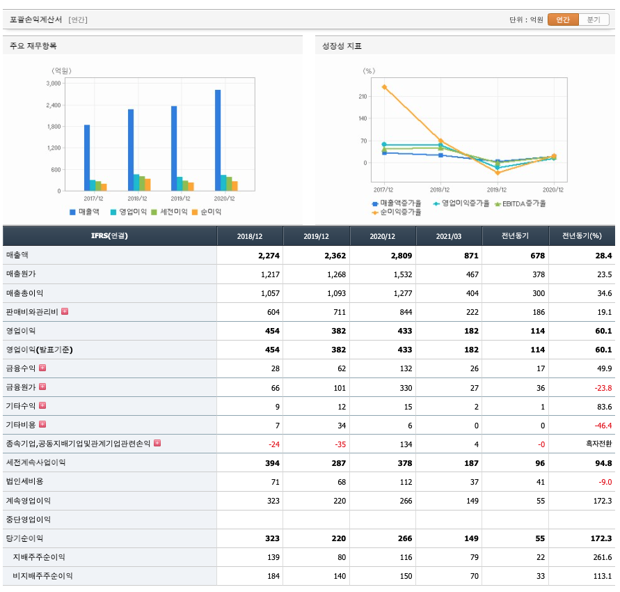 매출액 : 2018년 2274억원, 2019년 2362억원, 2020년 2809억원로 증가, 2021년 1분기 871억원으로 전년동기대비 증가하였습니다. 2021년 1분기는 전년동기대비 28.4% 증가하였습니다. 2020년 분기별로 보면 2분기 711억원, 3분기 727억원, 4분기 693억원입니다.