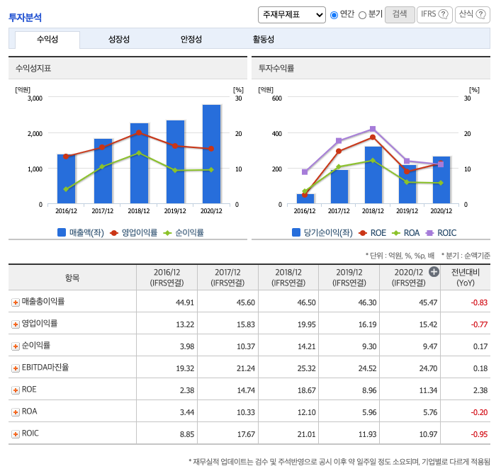 영업이익률 : 2016년 약 13.32%, 2017년 약 15.83%로 증가, 2018년 약 19.95%로 증가, 2019년 약 16.19%로 감소, 2020년 약 15.42%으로 감소하였습니다.
