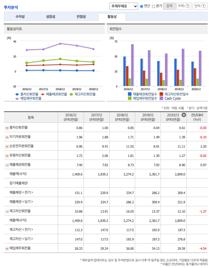 재고자산회전율 : 2018년 약 165억원, 2019년 약 187억원, 2020년 약 276억원이고, 회전율은 2018년 약 16회, 2019년 약 13회, 2020년 약 12회로 안정적입니다.