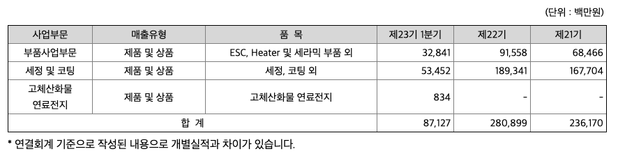 - 세라믹 소재 및 부품 전문기업으로 반도체 공정용 부품과 세정사업을 영위