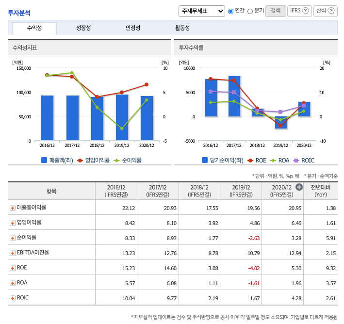 영업이익률 : 2016년 약 8.42%, 2017년 약 8.10%로 감소, 2018년 약 3.92%로 감소, 2019년 약 4.86%로 증가, 2020년 약 6.46%으로 증가하였습니다.