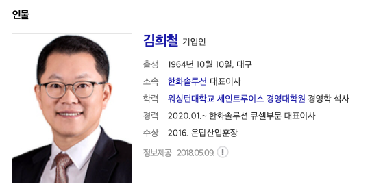 ※ 舊 한화케미칼(주)은 한화첨단소재(주)의 유상 증자에 참여하였으며 (공시일자 2018년 9월 11일), 한화첨단소재(주)는 해당 대금의 일부를 한화큐셀코리아(주)를 흡수 합병하는 데 합병교부금으로 지급하였습니다 (합병등기일 2018년 11월 1일). 당시 합병으로 한화큐셀코리아(주)는 소멸하였으며, 존속 법인인 한화첨단소재(주)는 한화큐셀앤드첨단소재(주)로 사명변경 하였습니다.