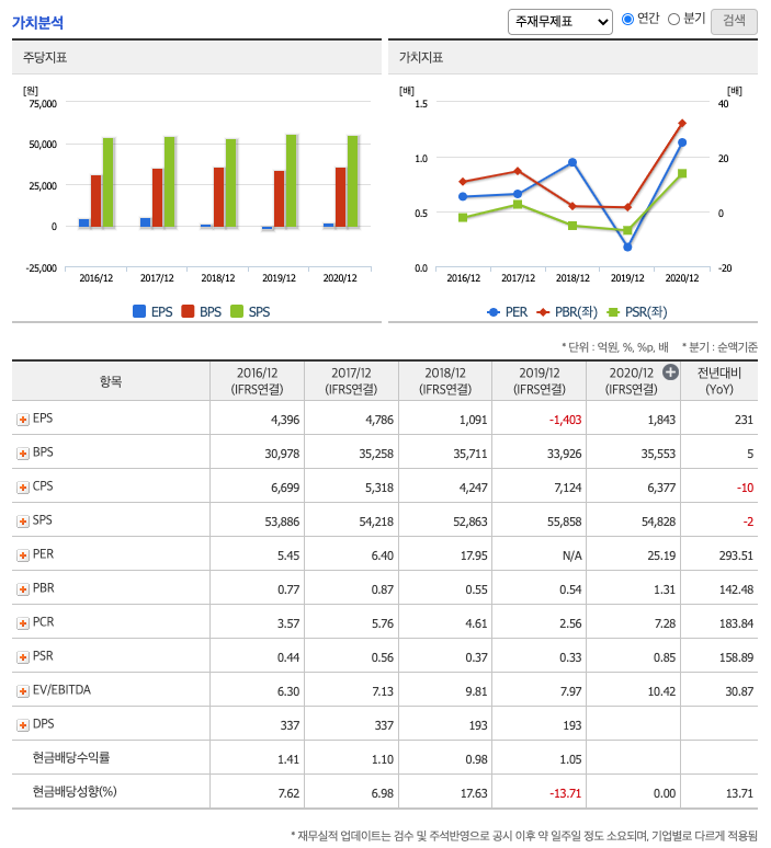 DPS(Dividend Per Share의 약자, 총배당금을 총주식발생수로 나눈 것, 한 주당 얼만큼의 배당금을 받을 수 있는지 알 수 있는 지표, DPS가 높을 수록 배당금이 많은 것임) : 2016년 337원, 2017년 337원, 2018년 193원으로 감소, 2019년 193원입니다.