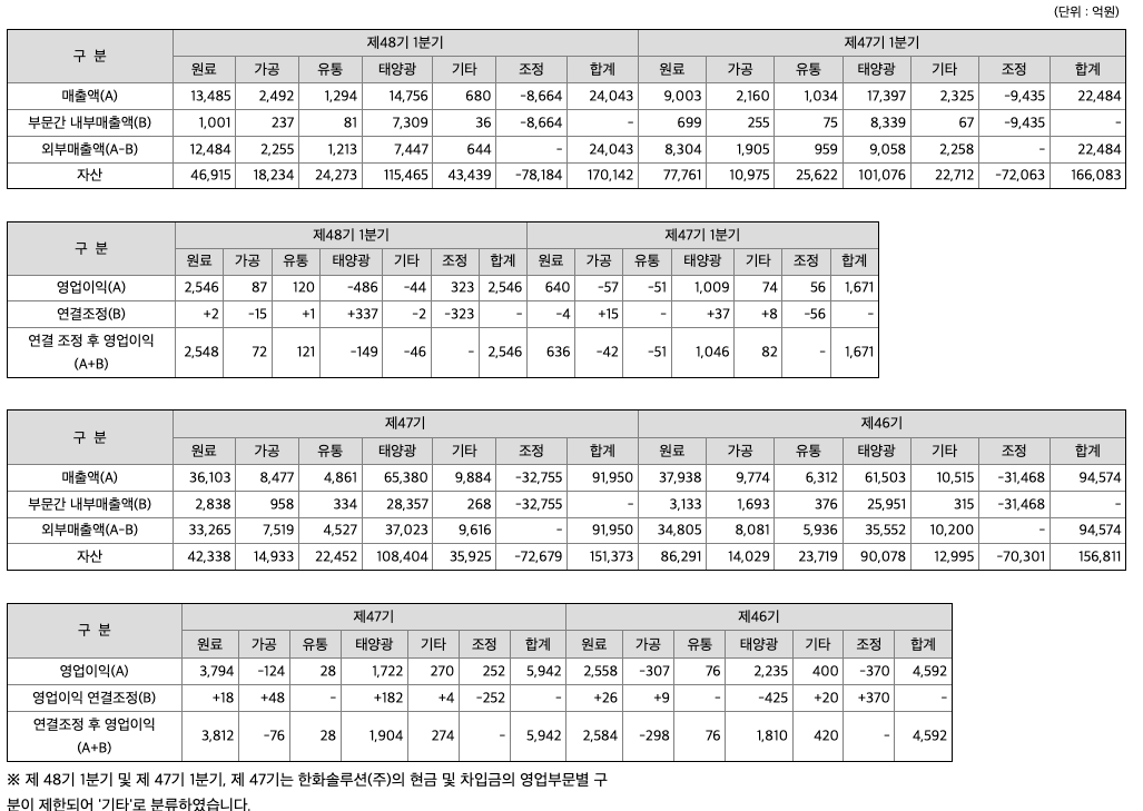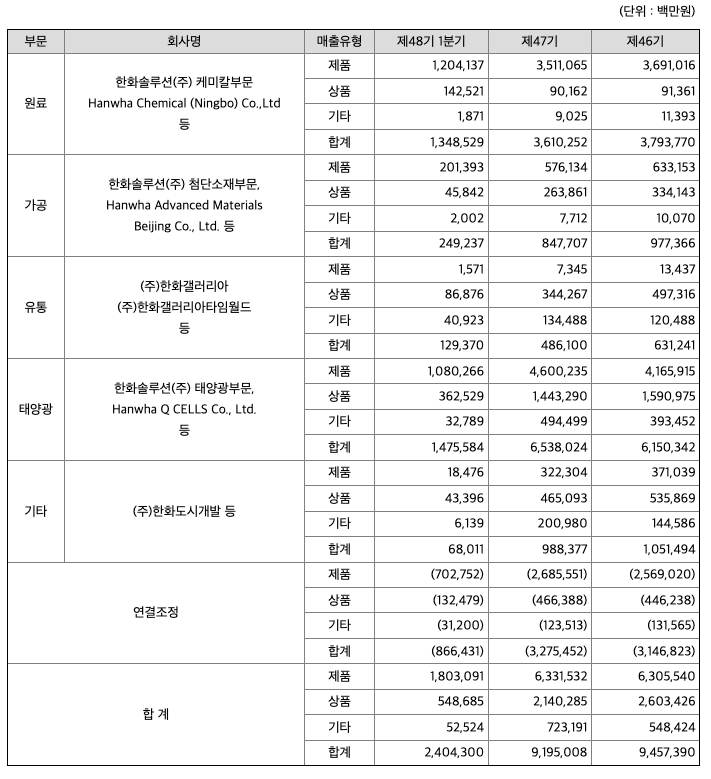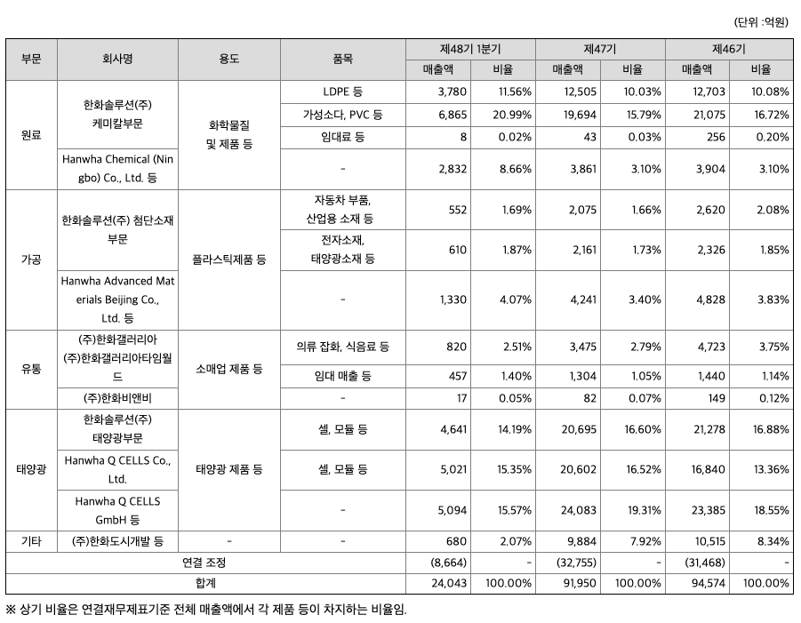 당사와 종속기업은 연결실체를 사업부문별로 사업의 특성에 따라 원료부문(한화솔루션(주) 케미칼부문, Hanwha Chemical (Ningbo) Co. Ltd 등), 가공부문(한화솔루션(주) 첨단소재부문 등), 유통부문((주)한화갤러리아, (주)한화갤러리아타임월드 등), 태양광부문(한화솔루션(주) 태양광부문, Hanwha Q CELLS Co.,Ltd 등), 기타부문((주)한화도시개발 등)으로 구성되어 있습니다.