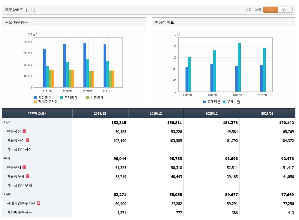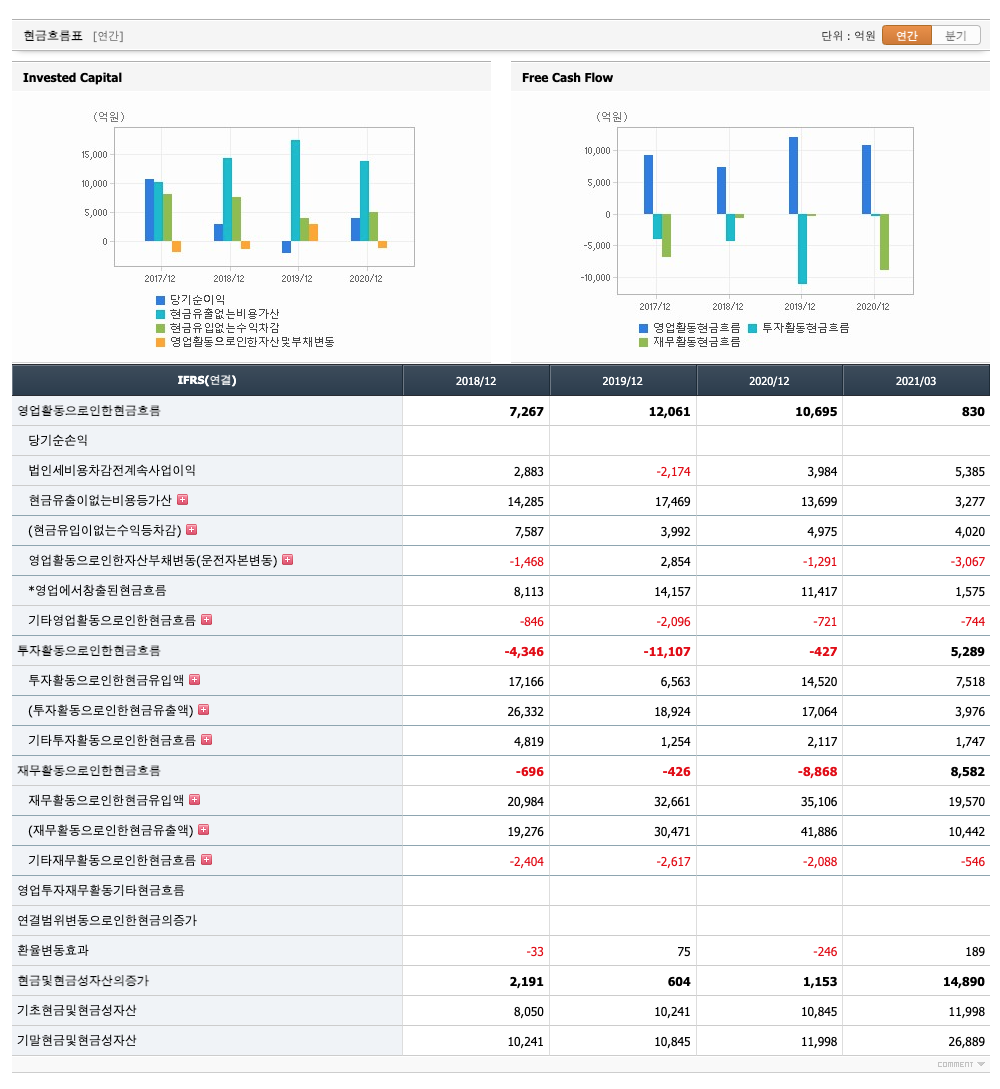 재무활동 현금흐름 : 2018년 -696억원, 2019년 -426억원, 2020년 -8868억원, 2021년 1분기 8582억원으로 2018년~2020년의 재무활동 현금흐름은 마이너스, 2021년 1분기 재무활동 현금흐름은 플러스였습니다.