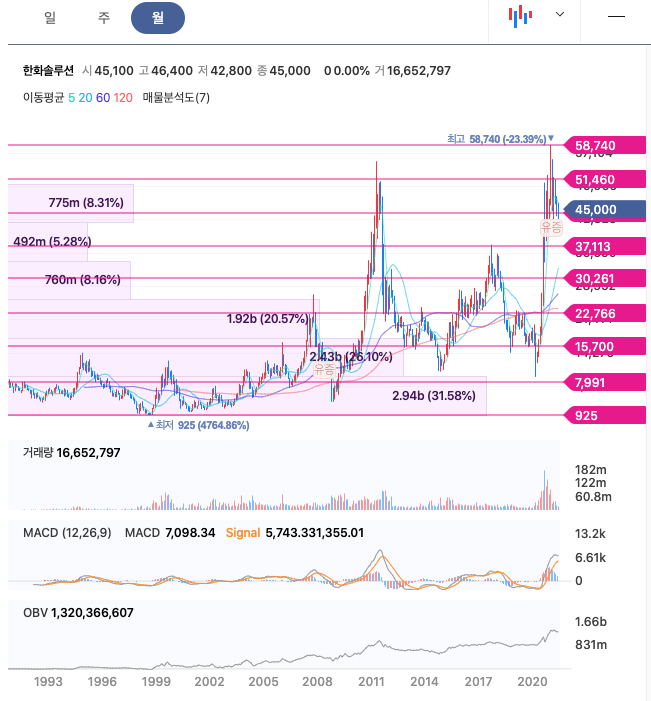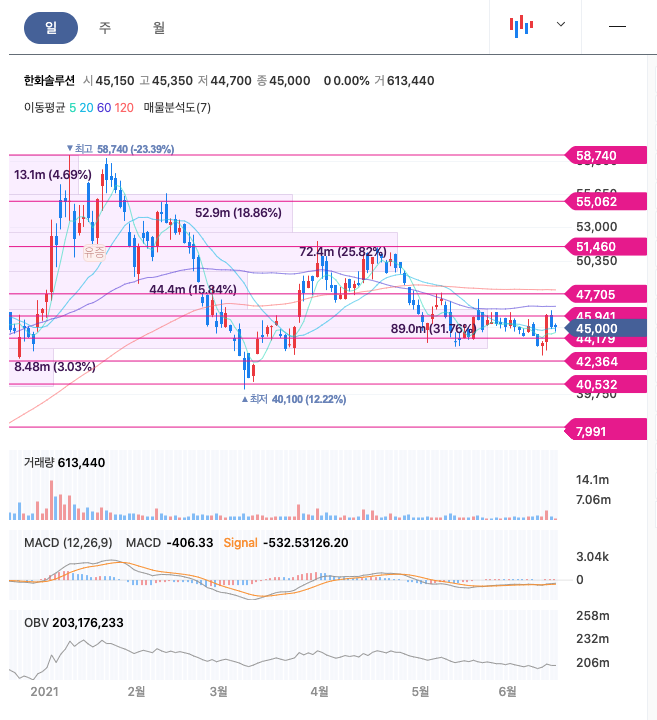 | 한화솔루션 | 45,050원 | 47,204원 | 47,369원 | 46,991원 |