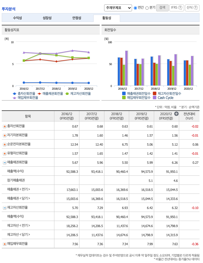 유보율 : 2018년 약 651%, 2019년 약 606%, 2020년 약 636%로 증가하고 있고, 유보율이 낮아 사내 유동자산이 좋지 않습니다.