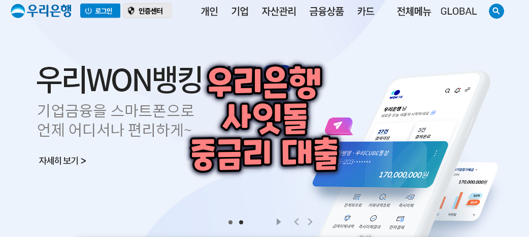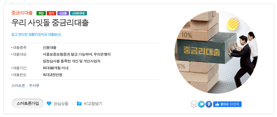전체상품 대출>인터넷대출신청 STEP 처리 --> 우리 사잇돌 중금리대출 중금리대출 추천 인기 신상품 스마트우대 쉽고 편리한 생활안정자금 대출(5년) 대출종류신용대출 대출대상서울보증보험증