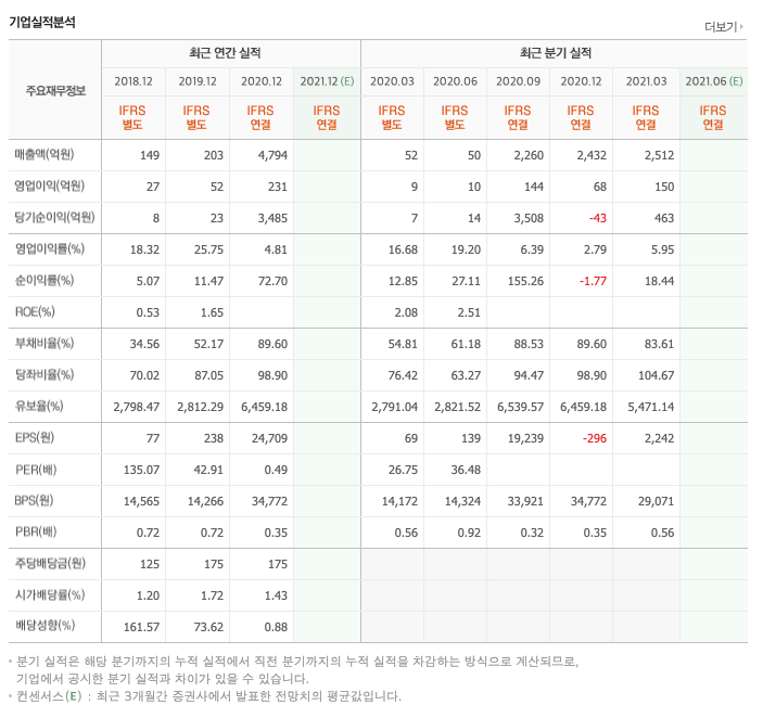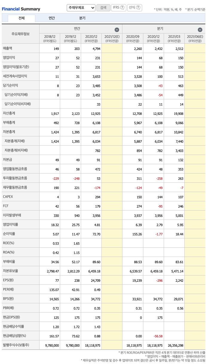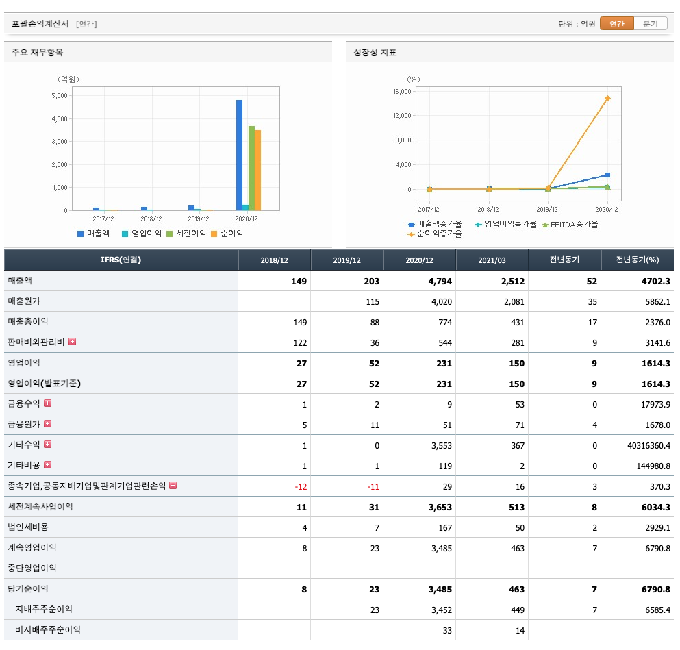 매출액 : 2018년 149억원, 2019년 203억원, 2020년 4794억원으로 증가, 2021년 1분기 2512억원으로 전년동기대비 증가하였습니다. 2021년 1분기는 전년동기대비 4702.3% 증가하였습니다. 2020년 분기별로 보면 3분기 2260억원입니다.