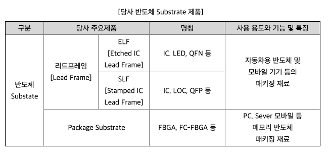 당사가 생산하는 '리드프레임'과 'Package Substrate'는 '반도체 Substrate'로 통칭할 수 있습니다. 공정구분에 따라서는 후공정(Back-End Process)에 속하는 재료이자 패키징 재료인 구조재료에 속하며,「한국산업표준분류」에서는 반도체 Substrate를 "전자부품, 컴퓨터,영상, 음향 및 통신장비 제조업(분류번호:C26)"으로 분류하고 있습니다. 리드프레임은 제품 패턴의 성형방법에 따라 SLF(Stamped IC Lead Frame)와 ELF(Etched IC Lead Frame)로 구분됩니다.