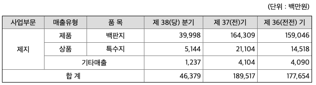 당사의 백판지 및 고급포장용지 등을 포함한 2021년 1분기말 현재 매출은 전년 동기 대비 1.9% 감소하였으며, 원부자재 가격의 상승으로 영업이익은 전년 동기 대비 20.7% 감소하였습니다. 지속적인 판매구조 개선과 생산성 향상 및 원가절감을 추진하여 매출 향상과 수익성 증대로 경쟁력을 개선하기 위해 노력하고 있습니다.