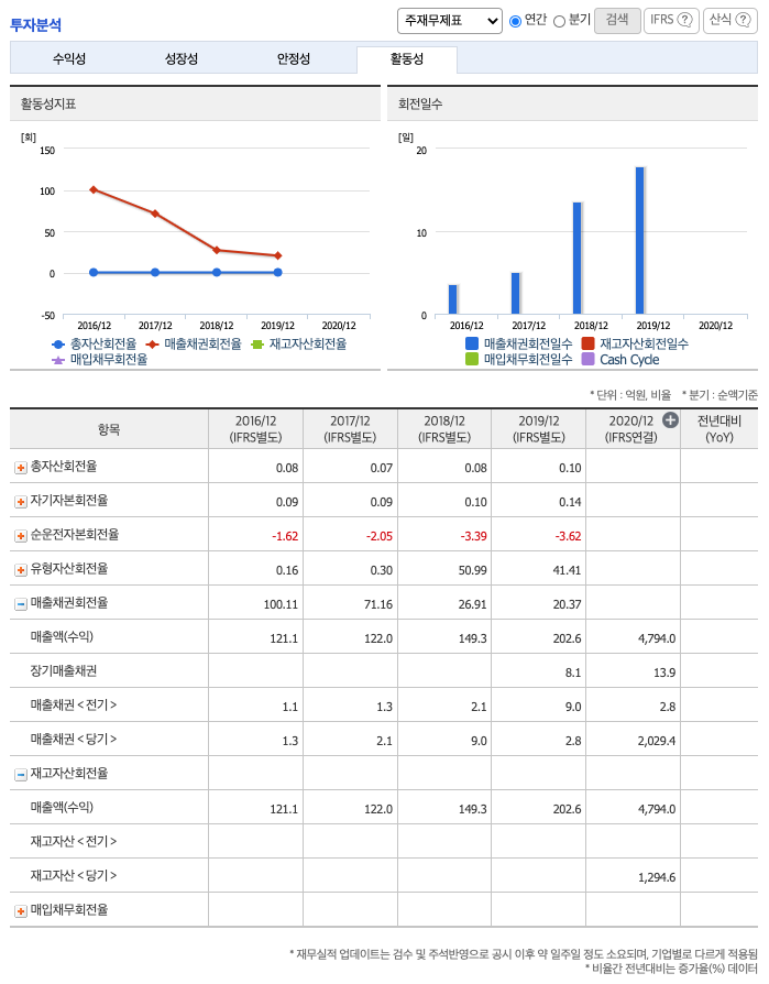 CAPEX(Capital expenditures,자본적 지출,미래의 이윤을 창출하기 위해 지출한 비용을 말함) : 2018년 4억원, 2019년 3억원, 2020년 294억원으로 CAPEX가 좋습니다.