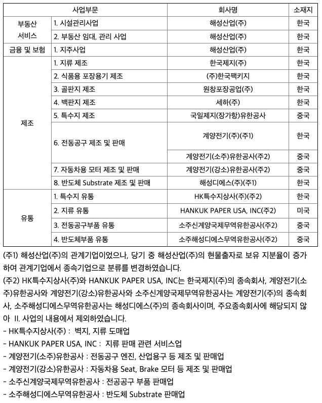 회사와 연결종속회사는 부동산 임대/관리, 지주사업, 지류 제조, 식품용 포장용기 제조, 특수지 제조, 전동공구 제조, 반도체 Substrate 제조 등으로 구성되어 있습니다. 각 사업부문별 회사 현황은 다음과 같습니다.
