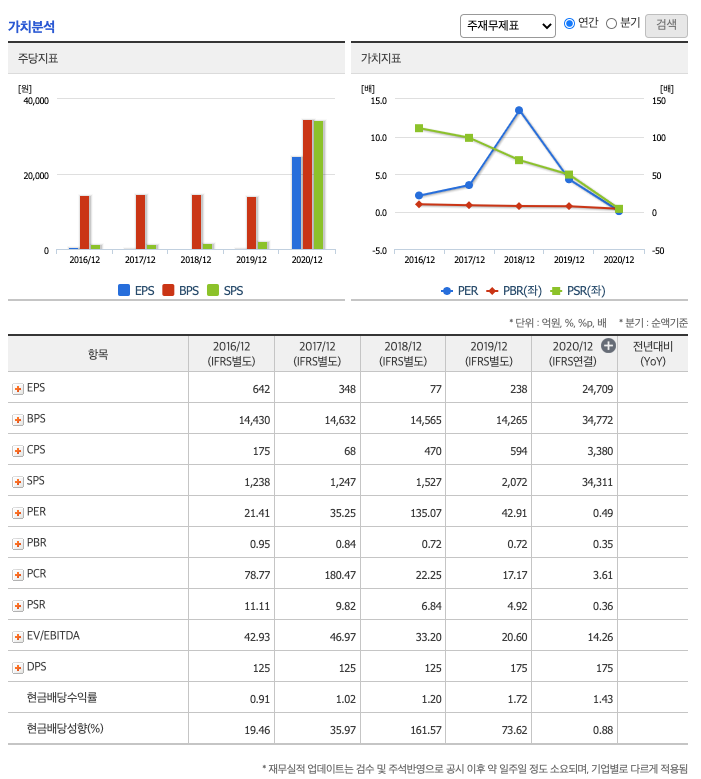 현금배당수익률(최근1년간 배당금 합계를 전일 보통주 주가로 나눈값) : 2016년 0.91배, 2017년 1.02배, 2018년 1.2배, 2019년 1.72배으로 증가, 2020년 1.43배으로 감소하였습니다.