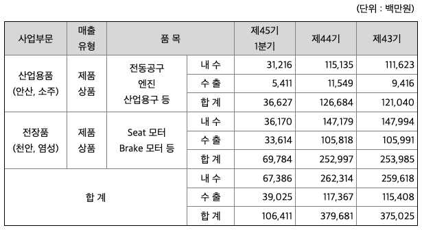 산업용품은 업계 최초로 초소형 세경 그라인더, 전기식 절단기, 파쇄형 햄머, 전기 드릴 등을 국산화하는데 성공하는 등 기술경쟁력을 보유하고 있으며, 국내 전동공구 시장에서 그라인더, 드릴류 및 절단기는 높은 점유율을 유지함으로써 주요 핵심 품목의 경쟁우위를 확보하고 있습니다. 충전공구 시장의 확대에 대비하여 핵심인 배터리 기술 개발에도 지속적으로 힘쓰고 있으며, 전자식 구동 메커니즘, 사용자의 안전성을 높여주는 기능 등을 적용해 혁신적이고 효율적인 신제품을 매해 새롭게 출시하고 있습니다. 전장품은 완성차의 좌석이나 파킹브레이크를 전자식으로 제어하는 모터를 생산하고 있습니다. Power Seat Motor, Steering Handle의 전동 Column용 Tilt & Tele Motor, Electric Parking Brake 용 Actuator, Powertrain용 Motor를 전략 기종으로 선정하여, 수주 활동 및 기술개발을 통해 사업 영역을 확대해 나가고 있습니다. 우수한 기술력 및 품질수준을 바탕으로 내수 시장에서 현대, 기아자동차 중형 이상 차종 대부분에 당사의 Seat용 모터를 납품하고 있으며, 타 Application용 모터의 점유율 증가를 위해 노력하고 있습니다. 또한, 수출 시장에서는 Lear사에 Seat용 모터를, Mando(해외)사에 Electric parking brake actuator를, Nexteer사에 Tilt&Tele actuator를 납품하고 있습니다.