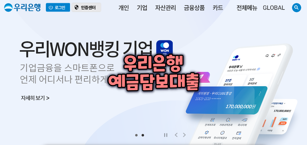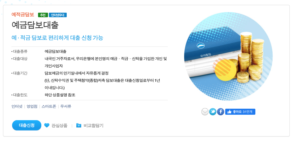 우리은행 예금담보대출은 예 · 적금 담보로 편리하게 대출 신청한 제품입니다.