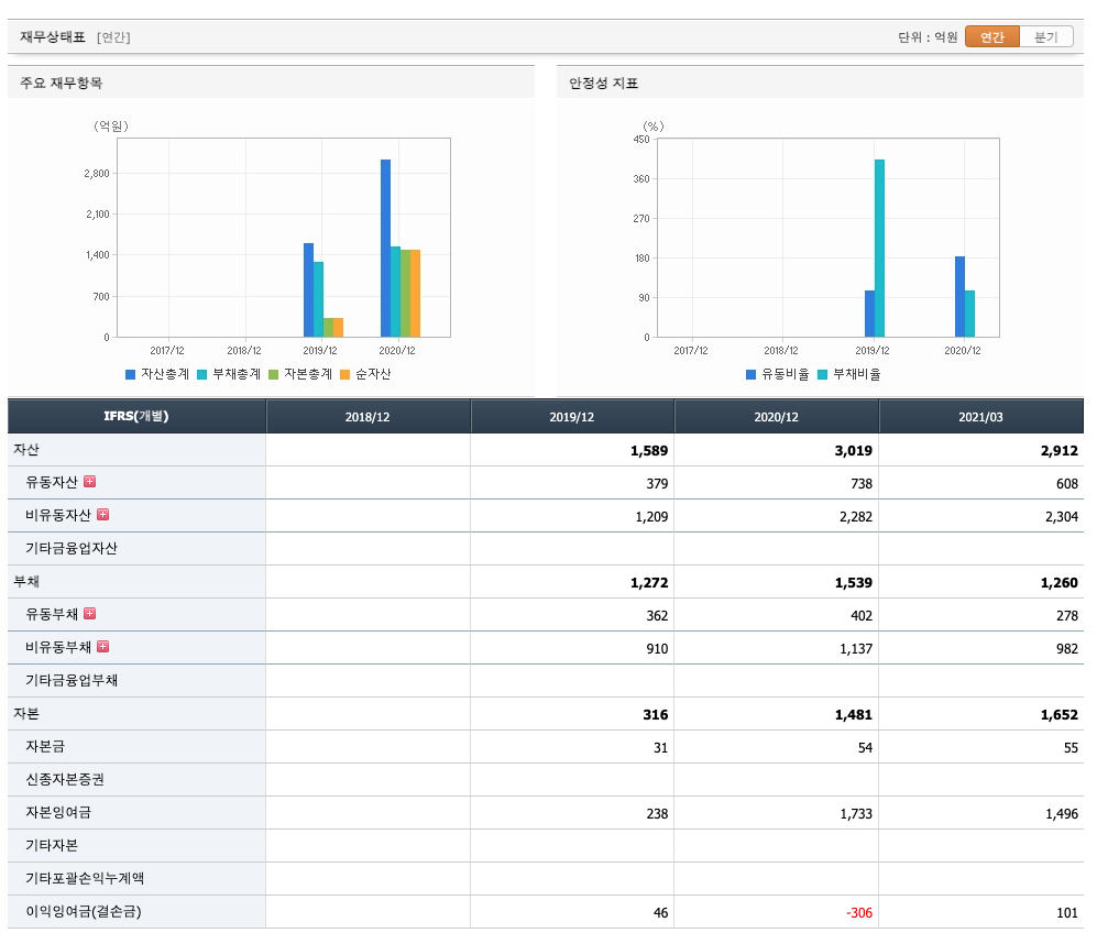 자산은 2019년 1589억원, 2020년 3019억원으로 증가, 2021년 1분기 2912억원으로 감소하였습니다.