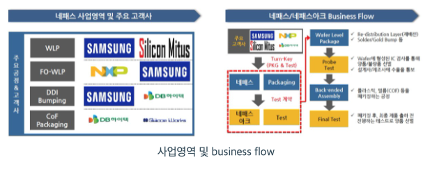 네패스는 고객사(Fabless)로부터 'Packaging & Test' 물량에 대해 Turn Key 계약 체결 하며, 이를 통해 네패스아크는 네패스 고객사의 Test 물량을 확보 즉, 보장된 매출이 존재하며 삼성전자향 PMIC, DDI 등에 대한 Test 물량을 확보하여 신규 공정에 대해 지속 개발 및 투자 확대를 통해 성장하고 있습니다.