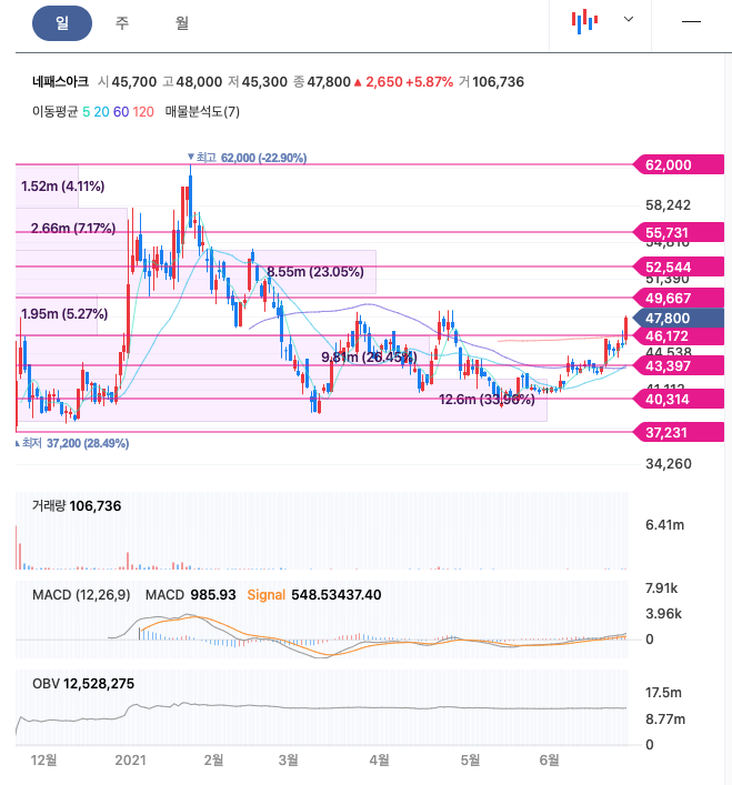 네패스아크는 20년 12월 주가가 급등하여 21년 1월에 최고 62,000원을 찍고, 조정을 받고 횡보하다가 최근 다시 반등을 주고 있습니다.