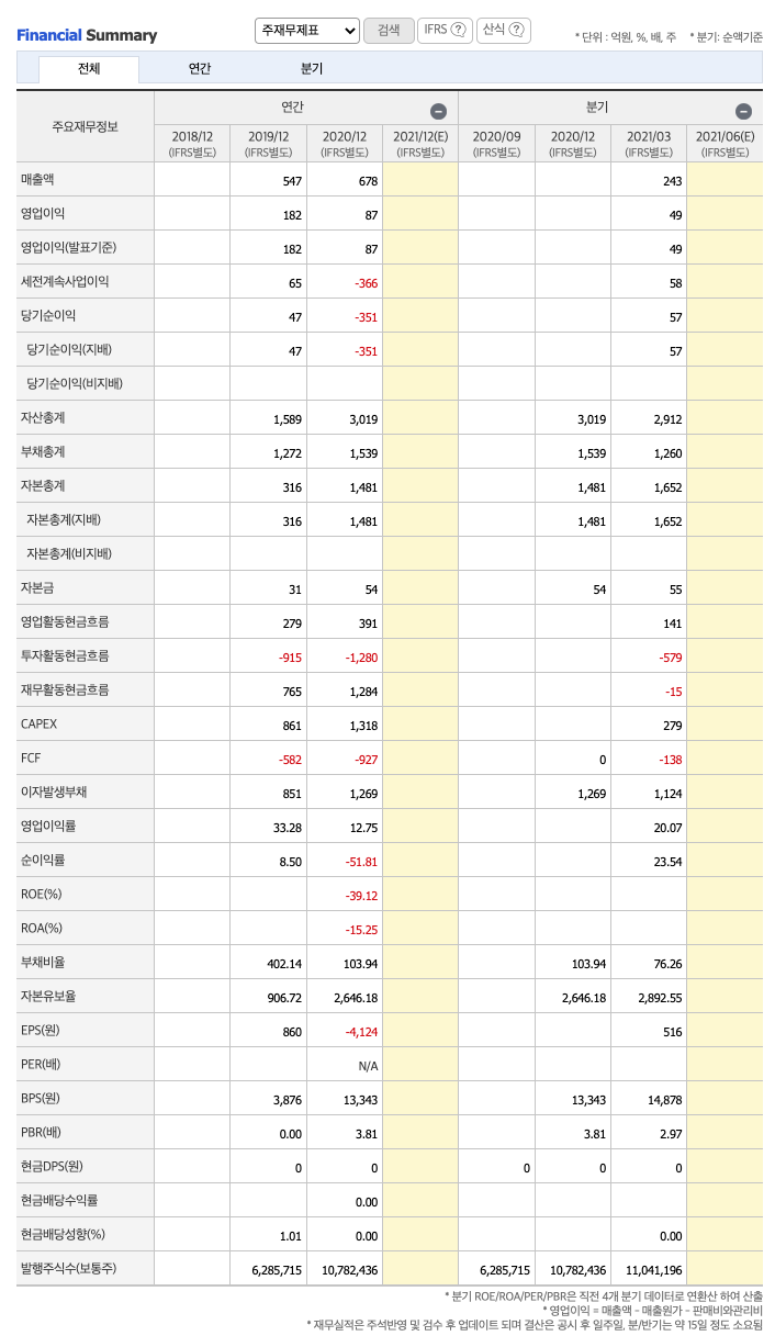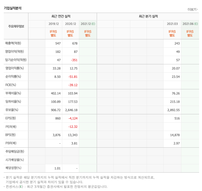 매출액 : 2019년 547억원, 2020년 678억원으로 증가, 2021년 1분기 243억원으로 전년동기대비 증가하였습니다. 2021년 1분기는 전년동기대비 19.4% 증가하였습니다. 2020년 분기별로 보면 2분기 158억원입니다.