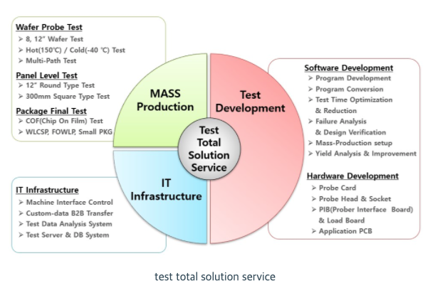 당사는 시스템반도체 생태계의 중요한 한 축을 담당하는 테스트 전문기업으로서 PMIC , DDI, SoC 등 영역의 반도체 테스트를 주력으로 영위하고 있습니다. 반도체 테스트 하우스는 기본적으로 종합 반도체 제조사 또는 파운드리 업체에서 제조한 다양한 제품군에 대응하는 테스트 장비와 기술적 Know-How 및 테스트 시스템 구축을 통해 제품의 전기적 동작 여부를 검사하여 양품과 불량품을 선별하는 역할을 수행합니다. 테스트 사업은 단순히 양품 및 불량품 선별에 국한되는 것이 아니라 테스트 과정을 통해 확보된 데이터를 기반으로 수율 분석이나 불량 원인 분석에 대해 Feedback을 실시하고, 이를 기반으로 팹리스 업체나 종합 반도체 제조사는 수율 개선이나 양산 리스크를 최소화하여 제품의 안정성을 도모할 수 있게 됩니다.