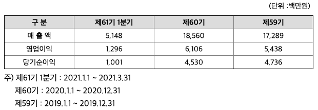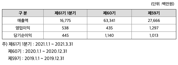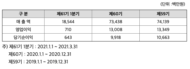 2018년 12월 14일 설립, 2021년 3월말 현재 당기순이익 약 4억원 시현