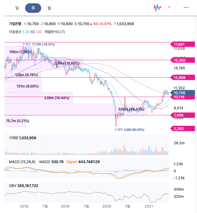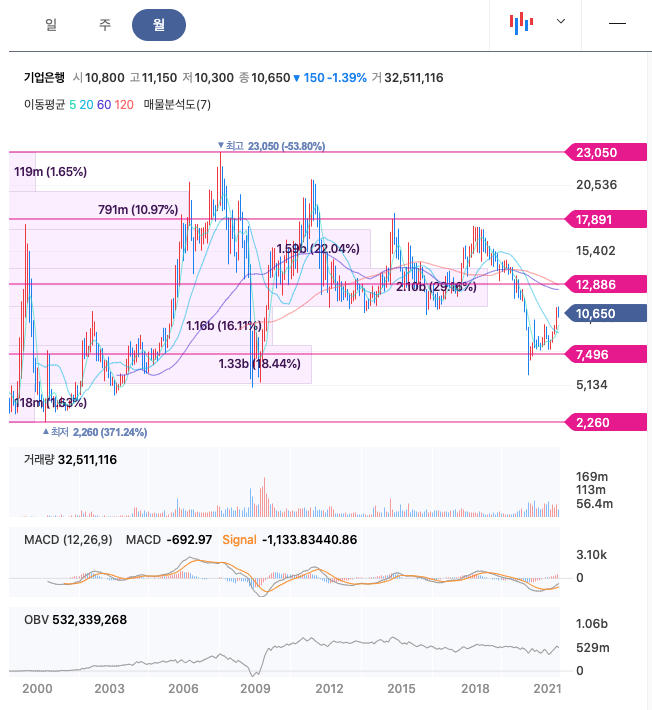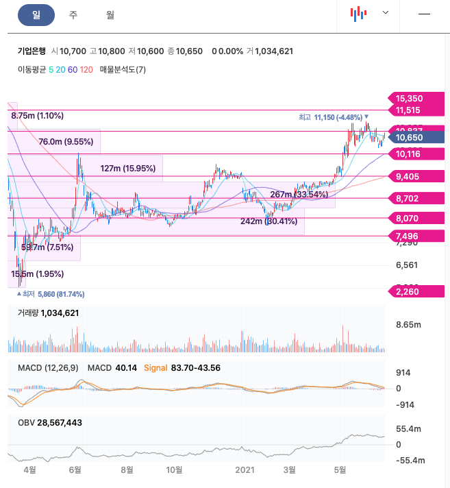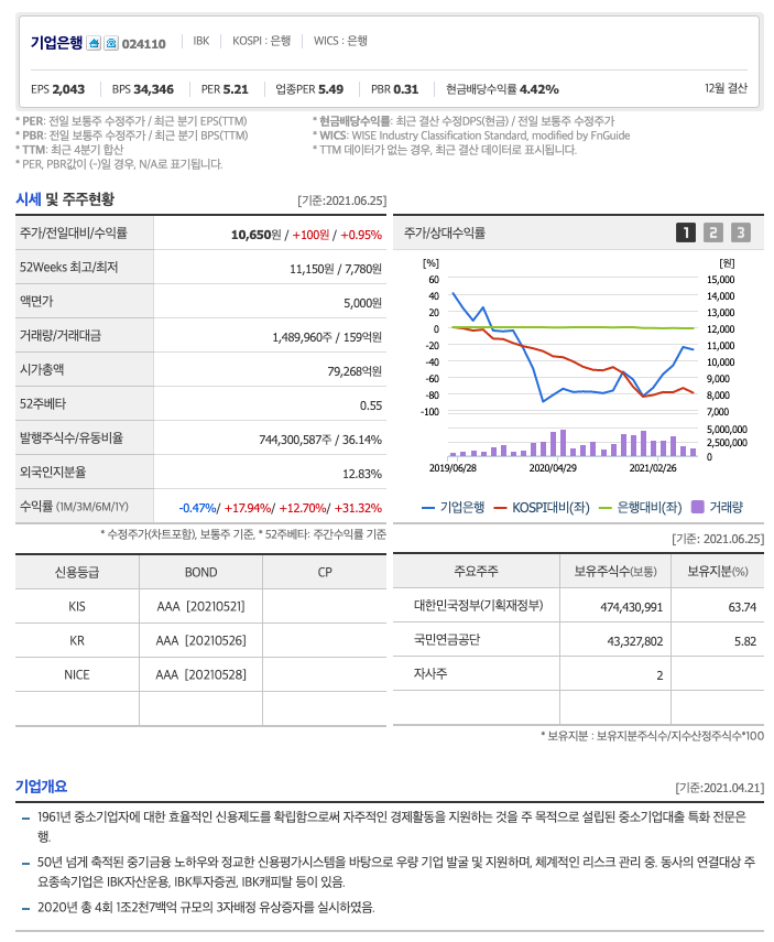 기업은행은 21년 2월에 주가가 반등하여 꾸준히 우상향하였고, 21년 6월에 최고 11,150월을 찍고, 보합중에 있습니다.
