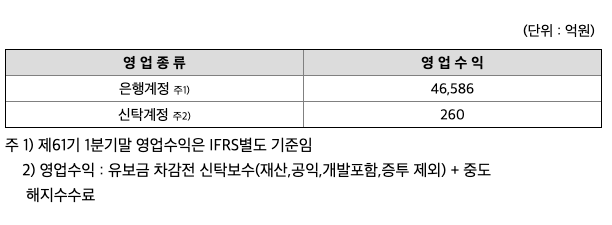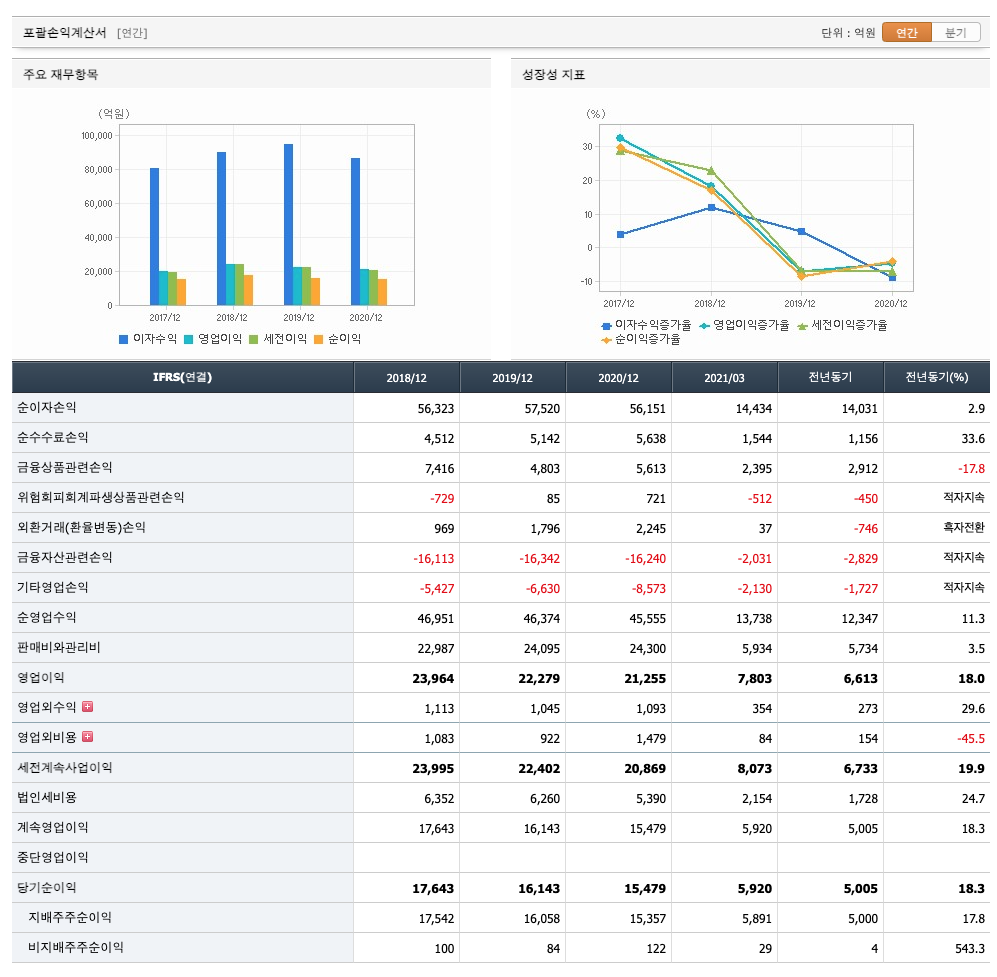 순이자손익 : 2018년 56,323억원, 2019년 57,520억원으로 증가, 2020년 56,151억원으로 감소, 2021년 1분기 14,434억원으로 전년동기대비 증가하였습니다. 2021년 1분기는 전년동기대비 2.9% 증가하였습니다. 2020년 분기별로 보면 2분기 14,229억원, 3분기 13,768억원, 4분기 14,123억원입니다.