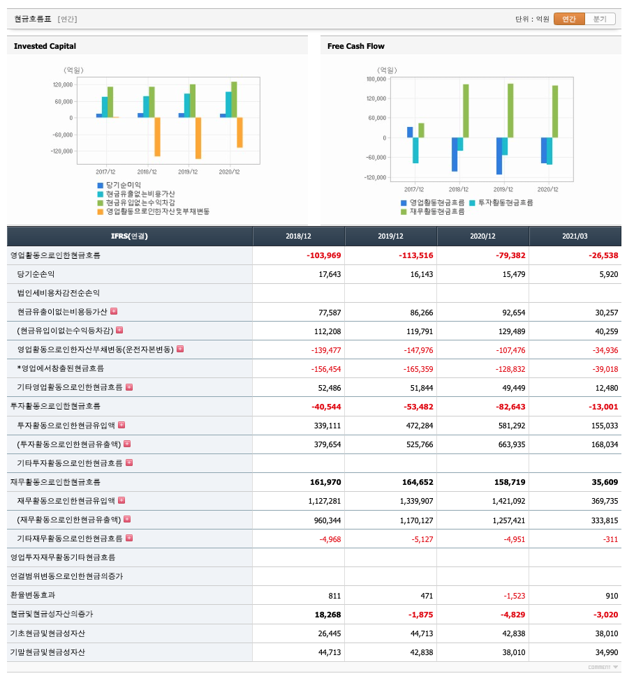 투자활동 현금흐름 : 2018년 -40,544억원, 2019년 -53,482억원, 2020년 -82,643억원, 2021년 1분기 -13,001억원으로 투자활동 현금흐름이 원활합니다.