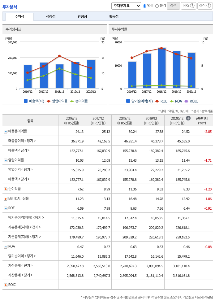 ROE(Return On Equity, 자기자본순이익율, 주주의 관점) : 2016년 약 6.59%, 2017년 약 7.98%로 증가, 2018년 약 8.63%로 증가, 2019년 약 7.36%로 감소, 2020년 약 6.44%으로 감소하였고, 자기자본순이익율은 이상율(10%)보다 낮습니다.
