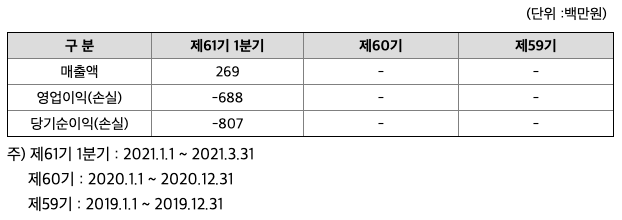 2021년 1월 21일설립, 2021년 3월말 현재 당기순손실 약 8억원 발생