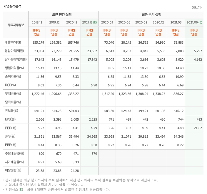 영업이익 : 2018년 23,964억원, 2019년 22,279억원으로 감소, 2020년 21,255억원으로 감소, 2020년 1분기 7803억원으로 전년동기대비 증가하였습니다. 2021년 1분기는 전년동기대비 18% 증가하였습니다. 2020년 분기별로 보면 2분기 4267억원, 3분기 4842억원, 4분기 5533억원입니다.