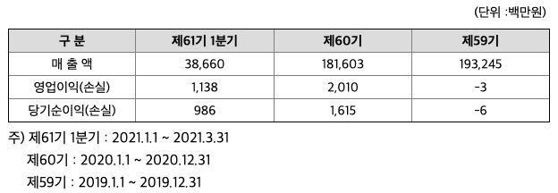 2021년 3월말 현재 당기순이익 약 6억원 시현