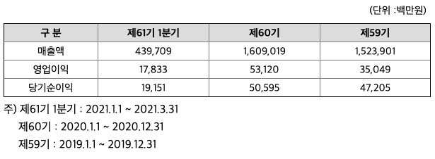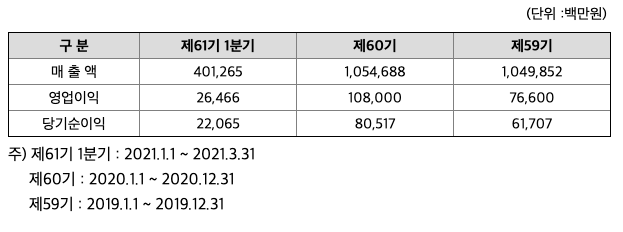 1991년 3월 22일 설립, 2021년 3월말 현재 당기순이익 약 10억원 시현