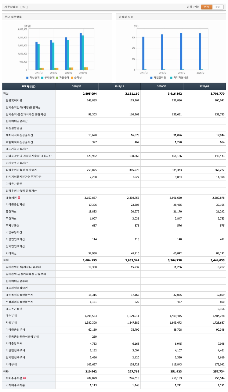 자산은 2018년 2,895,094억원, 2019년 3,181,110억원, 2020년 3,616,162억원, 2021년 1분기 3,701,770억원으로 증가하였습니다.