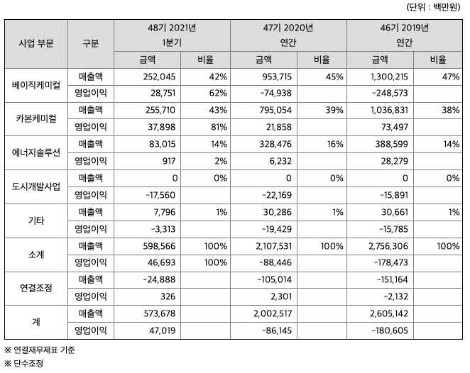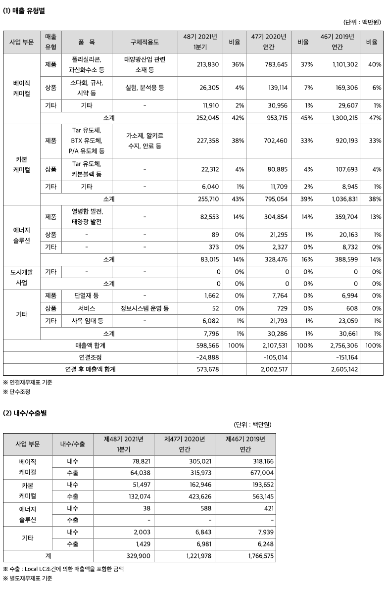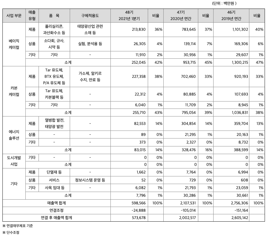 연결회사는 베이직케미컬 사업 부문(폴리실리콘 등 태양광산업 관련 소재 등), 카본케미컬 사업 부문(카본블랙, 핏치, 벤젠, P/A 등), 에너지솔루션 사업 부문(태양광 발전, 열병합 발전 등), 기타 사업 부문(단열재 등 관련 제품의 제조 및 판매, 부동산 임대, 도시개발사업 등)으로 영업활동을 영위하고 있습니다. 부문별 매출액과 총 매출액에서 차지하는 비율은 아래와 같습니다.